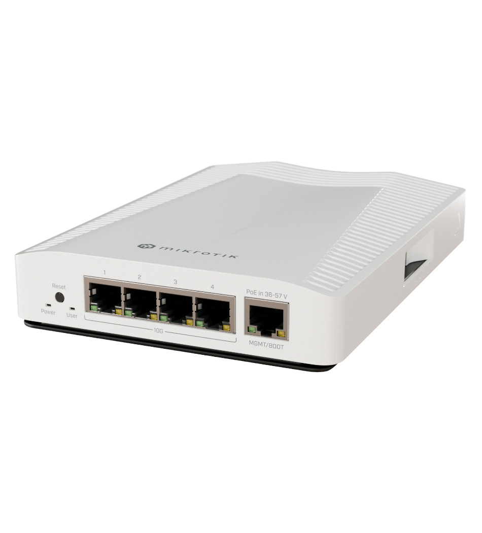 O CRS304-4XG-IN é um switch compacto e de altíssimo desempenho da linha Cloud Router Switch da MikroTik, projetado para ambientes corporativos, homelabs ou filiais que exigem conectividade 10 Gbps “pronta para uso”. Ele traz **4 portas Ethernet 10G nativas (10M/100M/1G/2.5G/5G/10G)**, mais uma porta Gigabit de gestão, sem necessidade de módulos adicionais.