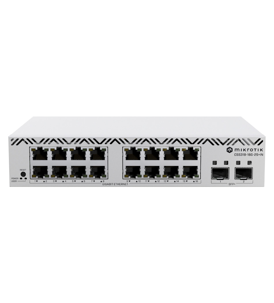 O MikroTik CSS318-16G-2S+IN é um switch managed da linha Cloud Smart Switch da MikroTik, ideal para redes de pequeno e médio porte ou ambientes rack onde 24 portas são “demais” e 8 são “insuficientes”. Com 16 portas Gigabit RJ-45 e 2 cages SFP+ para uplink de 10 Gbps, design compacto de ~10 polegadas (≈ 218 × 157 × 44 mm), montagem em rack 10″/19″ ou bancada, alimentação AC 100-240 V única, funcionamento fanless e baixo consumo (~10 W sem carga, até ~13 W sob carga).